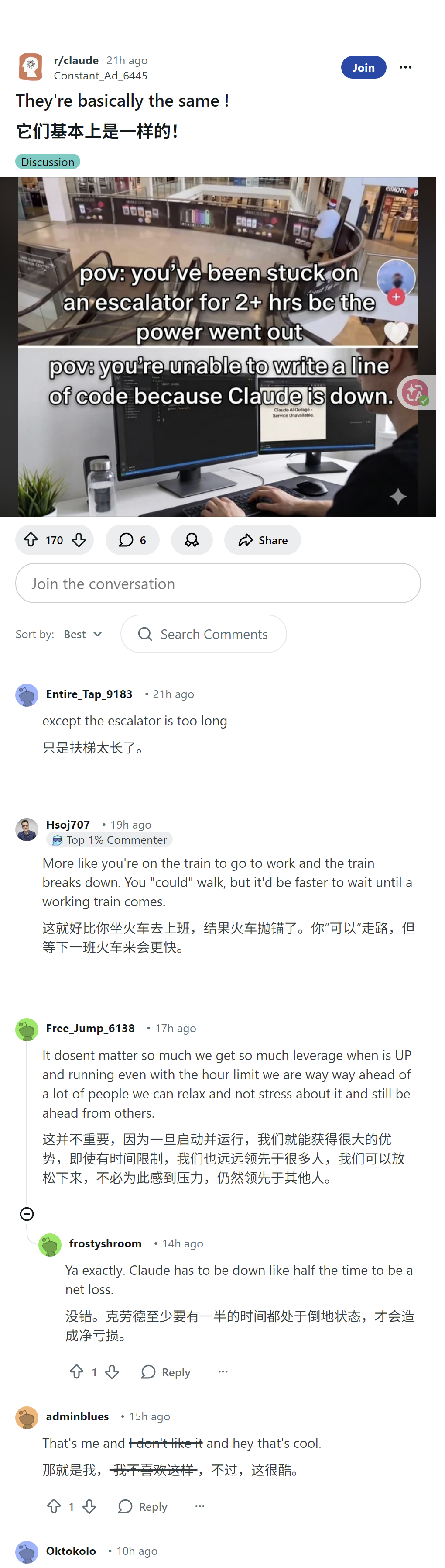 网友讨论认为二者本质相近,只是有细节区别;有人类比故障列车的情况,认为AI可用时优势很大,就算 Claude经常宕机,整体仍是净收益,还有网友吐槽分享了相关趣事。