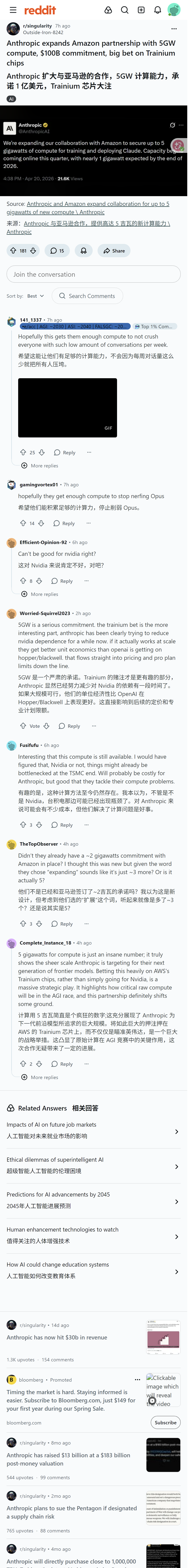 Anthropic与亚马逊扩大合作,承诺投入千亿美元、新增最高5吉瓦算力,重点采用AWS Trainium芯片。网友盼算力充足后解除Claude交互限制、停止削弱模型,也讨论了对英伟达的影响,认为此举是降低对英伟达依赖的重要布局。