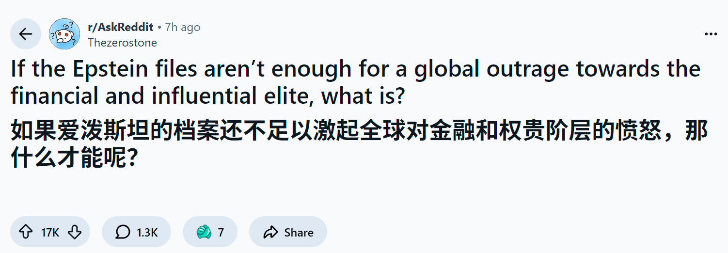 reddit爆火问题 如果爱泼斯坦的档案还不足以激起全球对金融和权贵阶层的愤怒,那什么才能呢?
