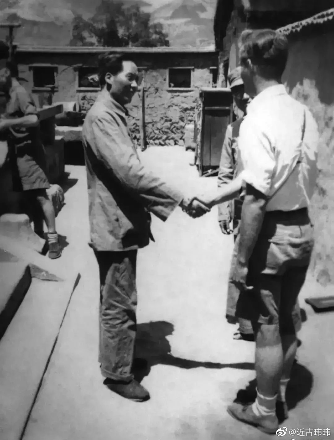 这张教员照片是第一次看到。据介绍,是一九三八年六月,延安,毛主席接见到访的“山西太谷铭贤学校”的美国代表赫博。清瘦的主席。出处微博近古玮玮