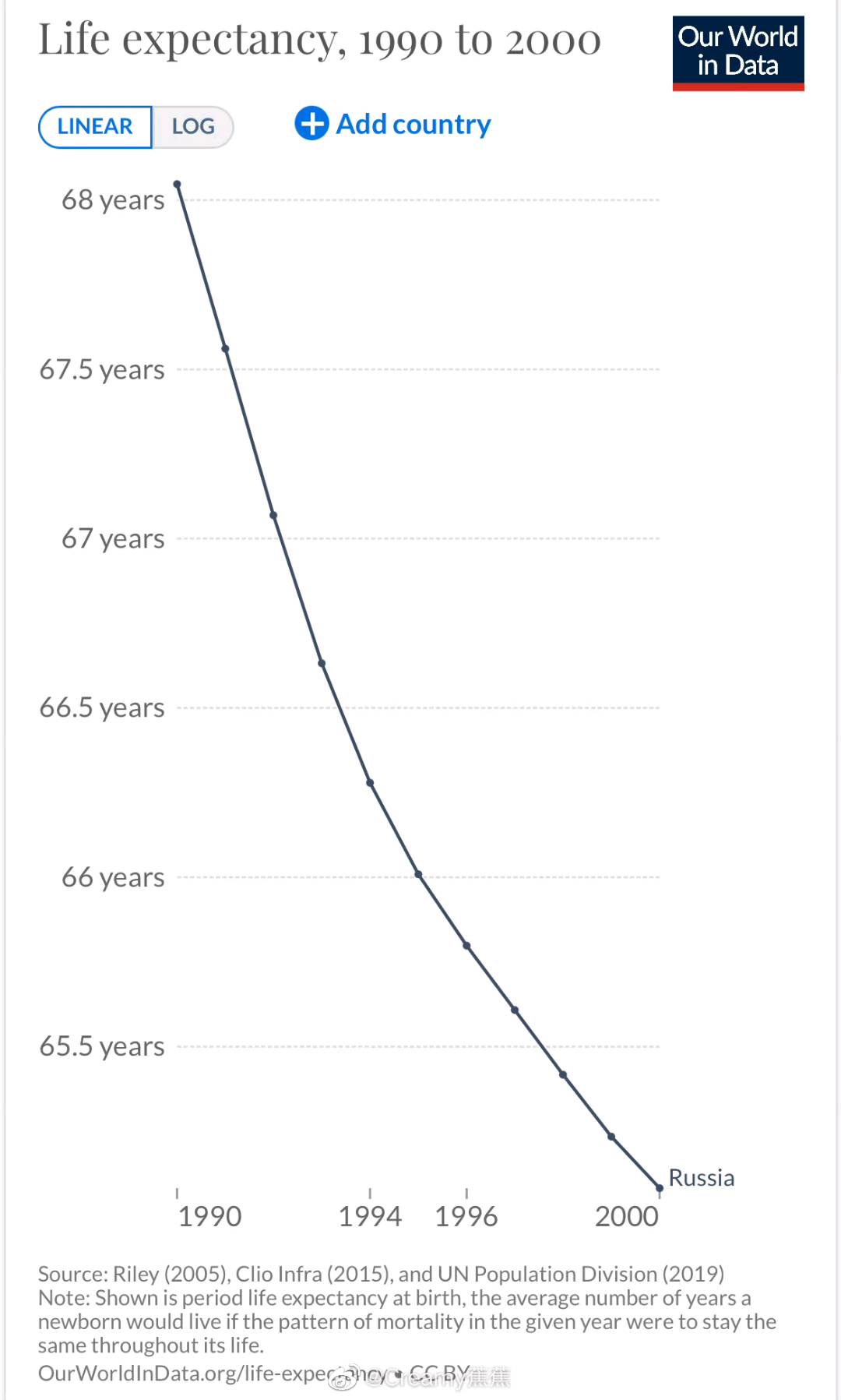 苏联解体后的10年,俄罗斯人均寿命下降了大约3岁。 美国更牛逼,2020年加上2021年仅仅两年,人均寿命就下降了3岁。 中国也是大概从2019年开始超过美国,到现在比美国快高两岁。