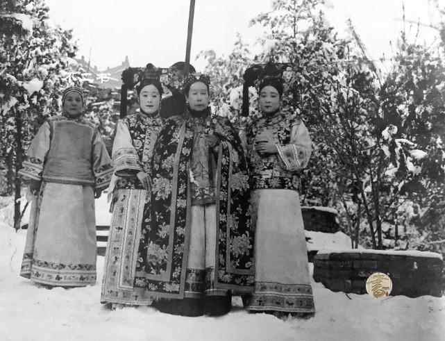 这张照片拍摄于1903年,西逃回銮的慈禧太后在随从的陪同下,在颐和园散步,此时进入冬季,积雪很厚,在德龄和荣龄的陪同下,迟暮之年的慈禧站在镜头前,脸上没有多余的表情。