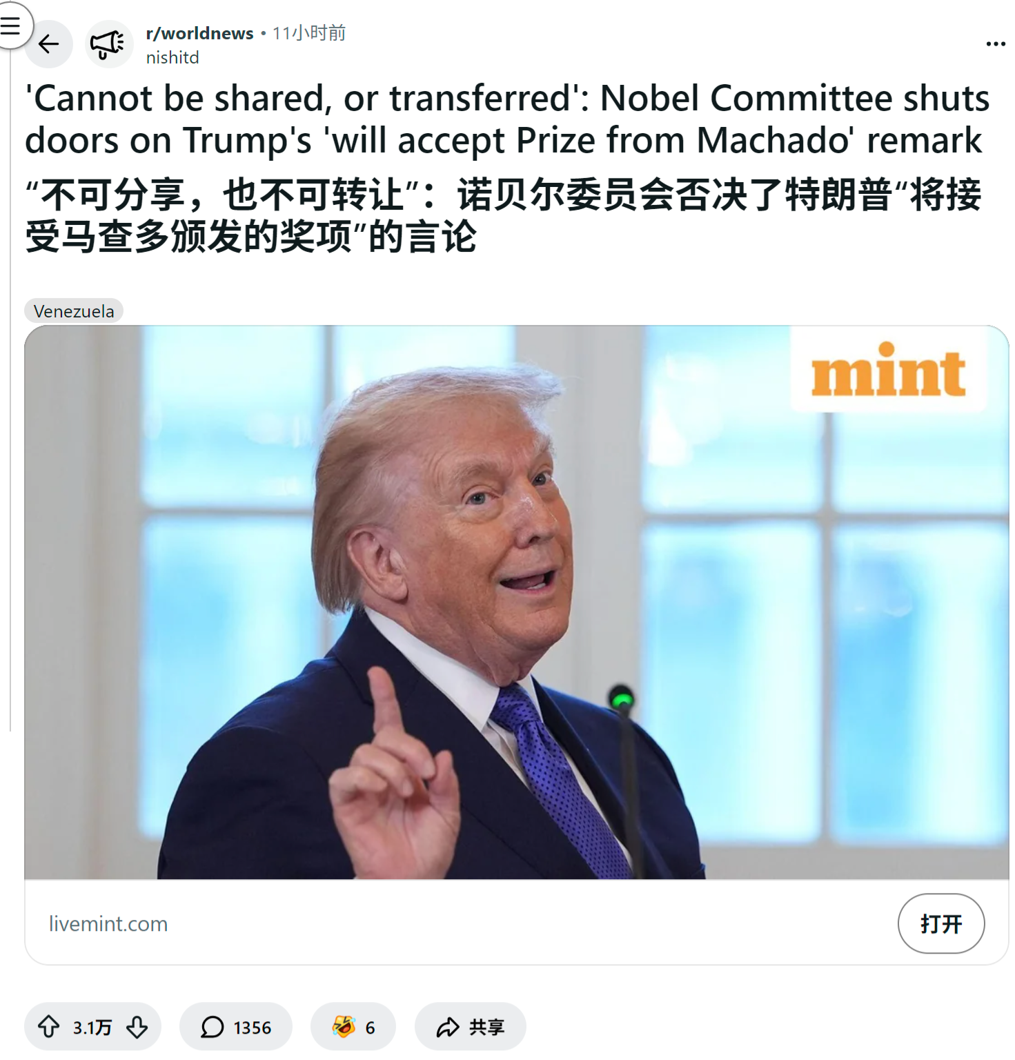 - reddit爆火 委内瑞拉反对派领导人马查多向特朗普颁发诺贝尔和平奖章