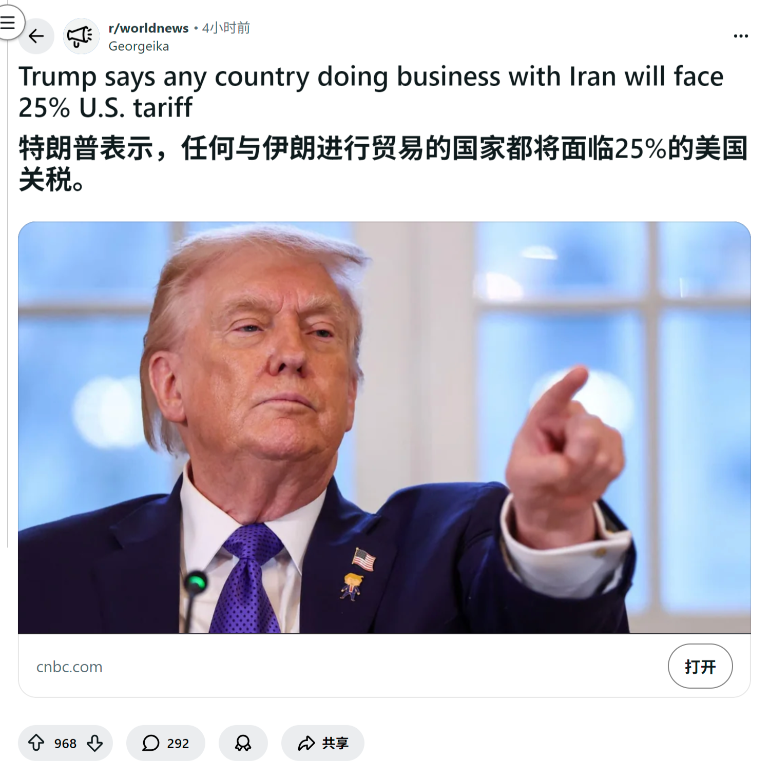 来源:https://www.reddit.com/r/worldnews/comments/1qb8lo7/trump_says_any_country_doing_business_with_iran/