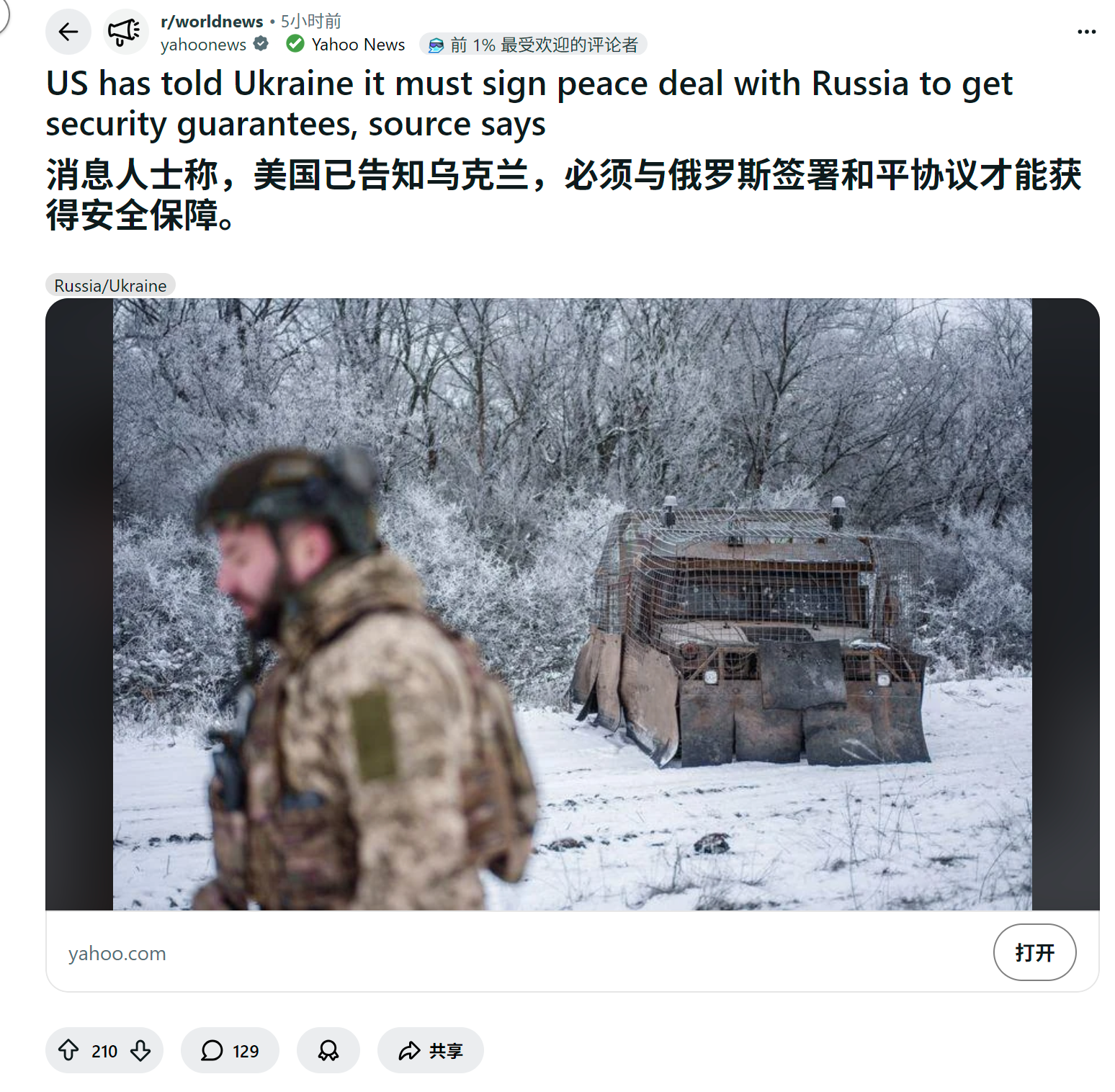 reddit热议 美国已告知乌克兰,必须与俄罗斯签署和平协议才能获得安全保障。