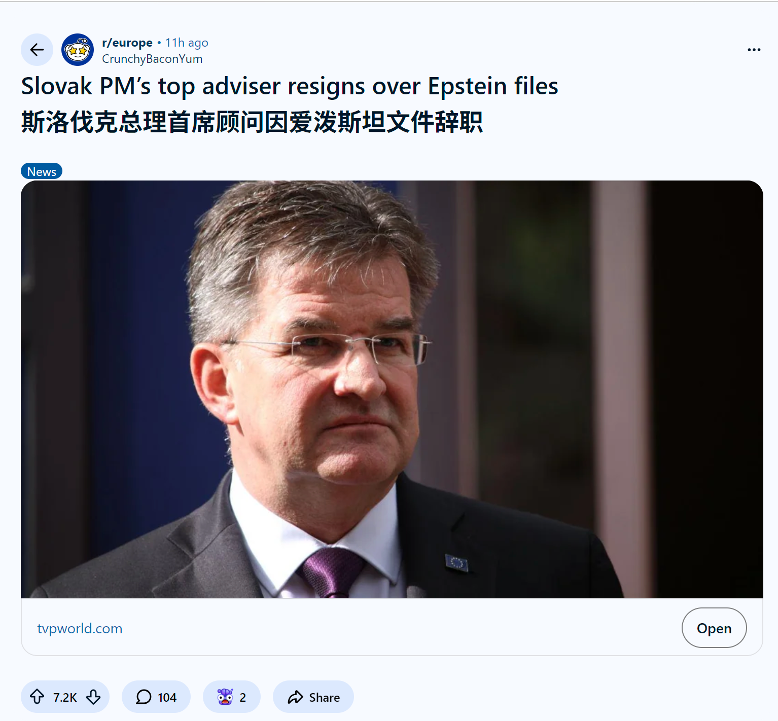 来源:https://www.reddit.com/r/europe/comments/1qsc6vb/slovak_pms_top_adviser_resigns_over_epstein_files/