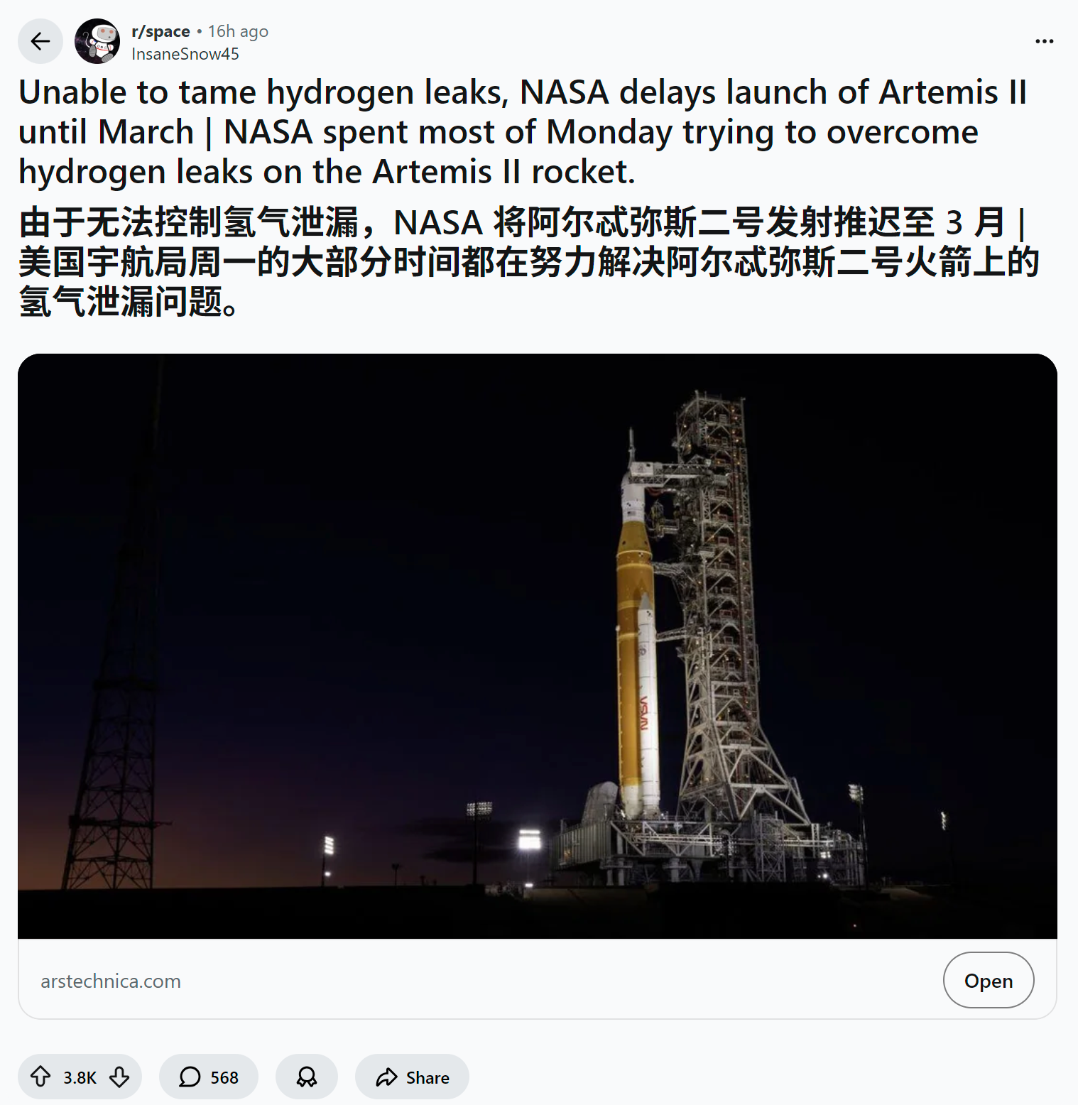 reddit热议 美国人怎么看由于无法控制氢气泄漏,NASA 将阿尔忒弥斯二号发射推迟至 3 月