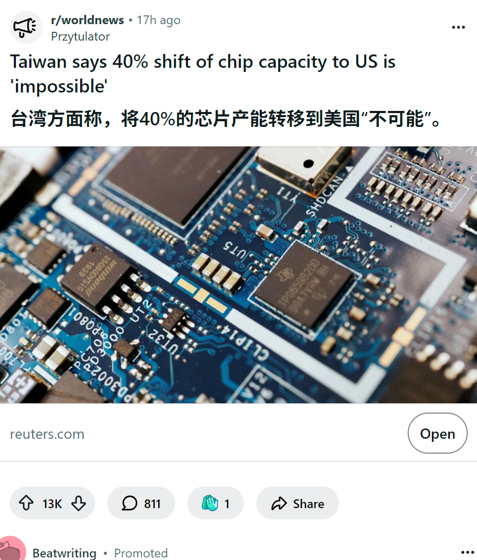 reddit爆火 台湾方面称,将40%的芯片产能转移到美国“不可能”。
