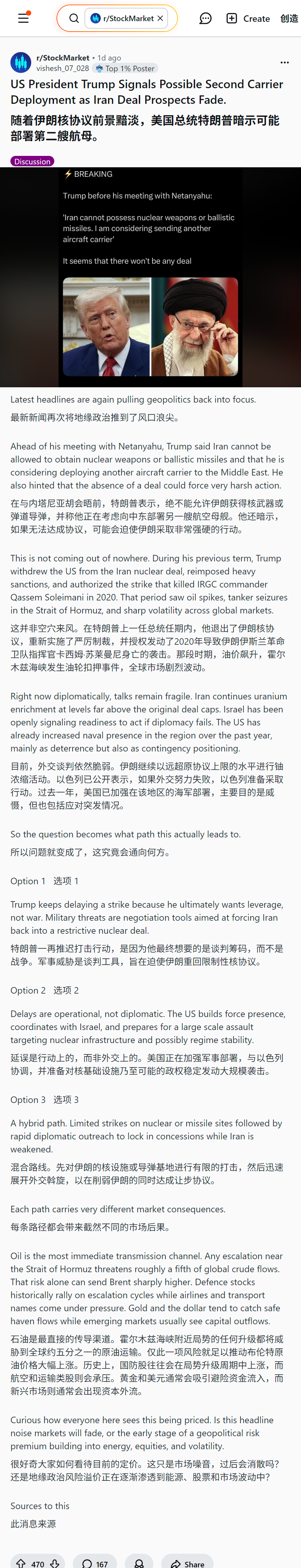 reddit热议 美国股民怎么看美国总统特朗普暗示可能部署第二艘航母到伊朗