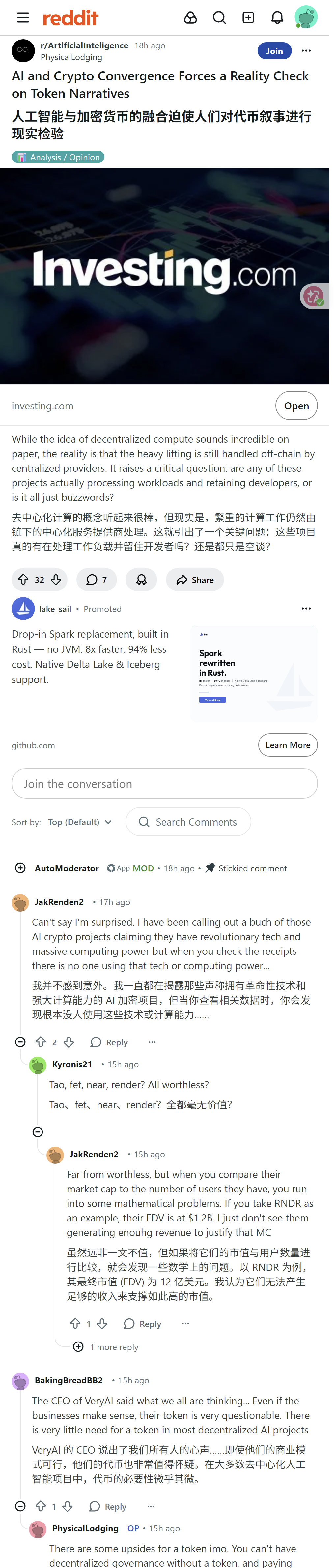 原帖指出,去中心化计算实际算力仍依赖中心化服务商,现有项目难证实力;网友多数项目用户少,市值与收入不匹配,多数去中心化AI项目没必要发币,原作者认可该观点,同时肯定代币在去中心化治理等方面的作用。