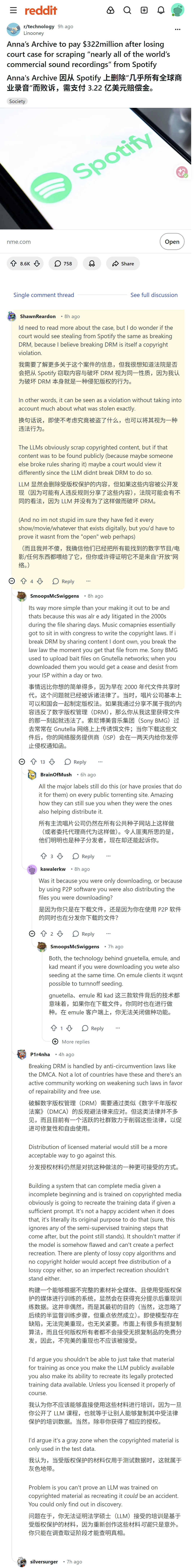 本案为Anna's Archive未出庭的缺席判决,网友围绕破解DRM的侵权定性、大模型训练使用版权内容的合法性,结合早年文件共享时代的相关判例展开讨论,点出唱片行业钓鱼诉讼、相关法律存争议等问题。