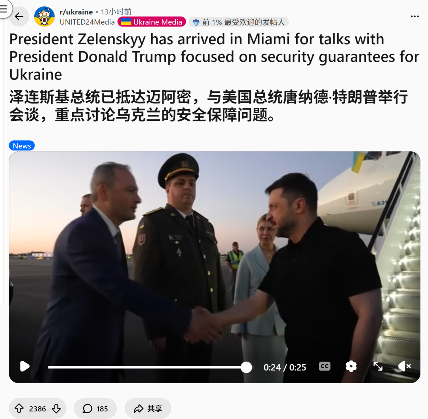 来源:https://www.reddit.com/r/ukraine/comments/1pxsm03/president_zelenskyy_has_arrived_in_miami_for/
