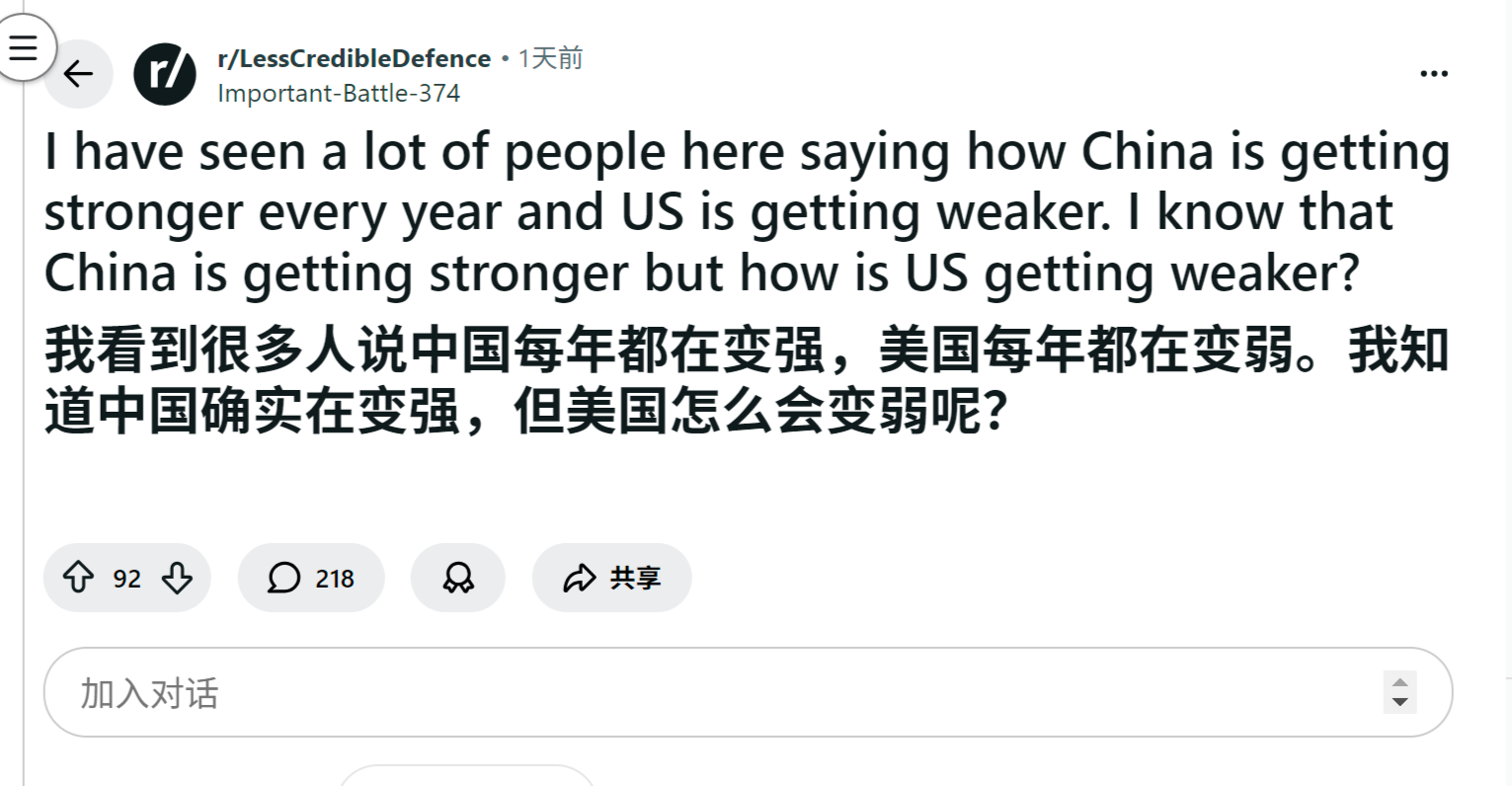 reddit热议 我看到很多人说中国每年都在变强,美国每年都在变弱。