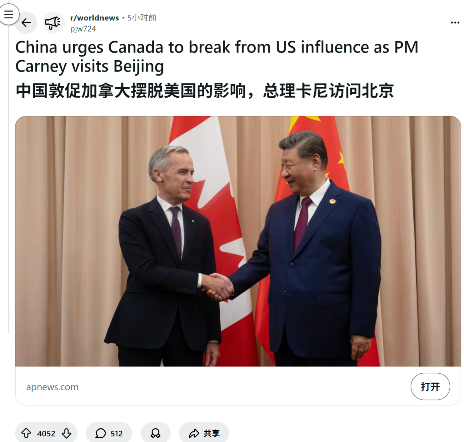 reddit热议 中国敦促加拿大摆脱美国的影响,总理卡尼访问北京