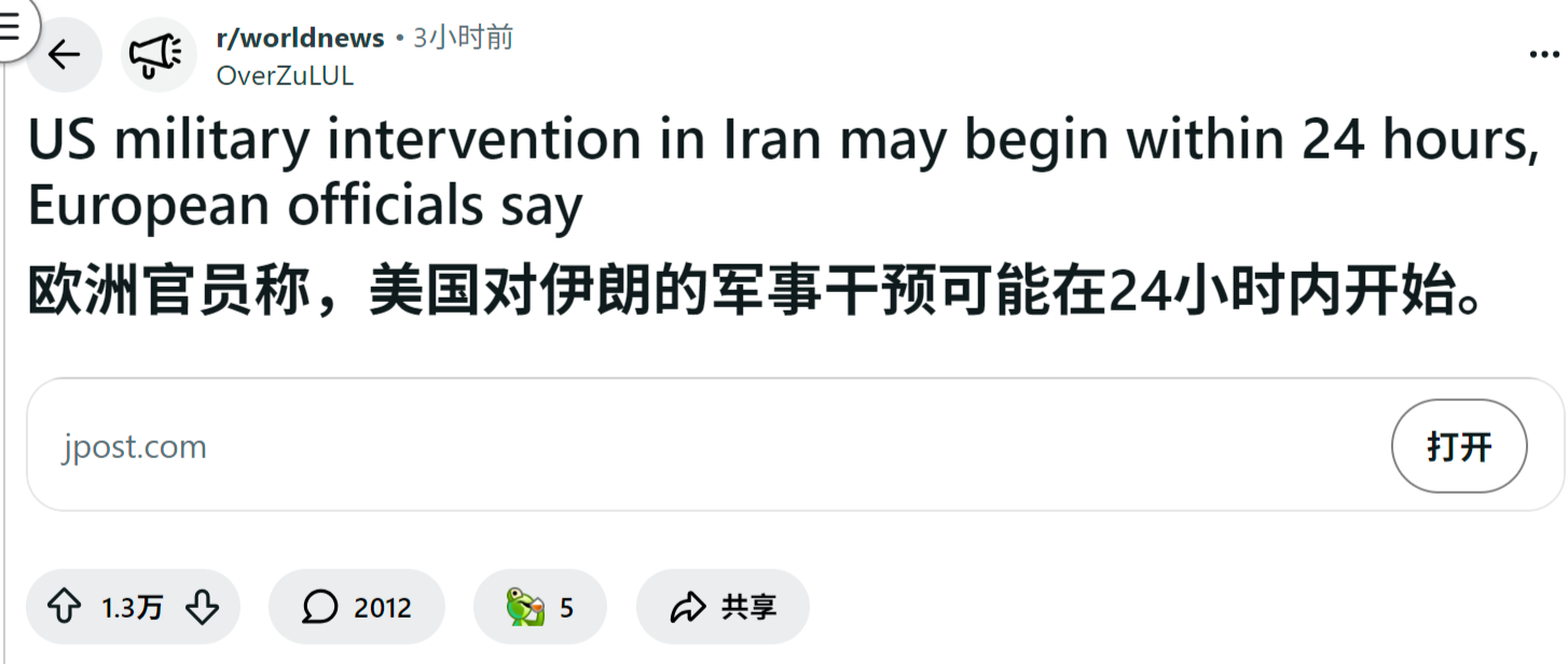 reddit爆火 欧洲官员称,美国对伊朗的军事干预可能在24小时内开始