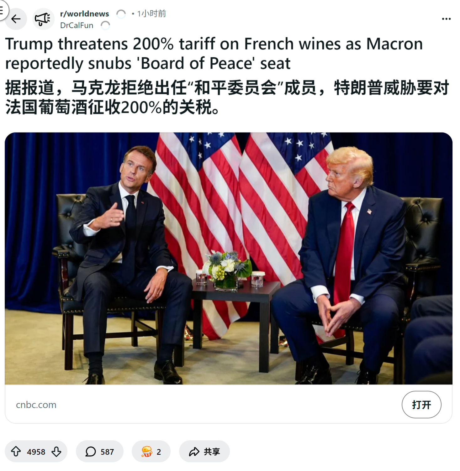 来源:https://www.reddit.com/r/worldnews/comments/1qhsowq/trump_threatens_200_tariff_on_french_wines_as/
