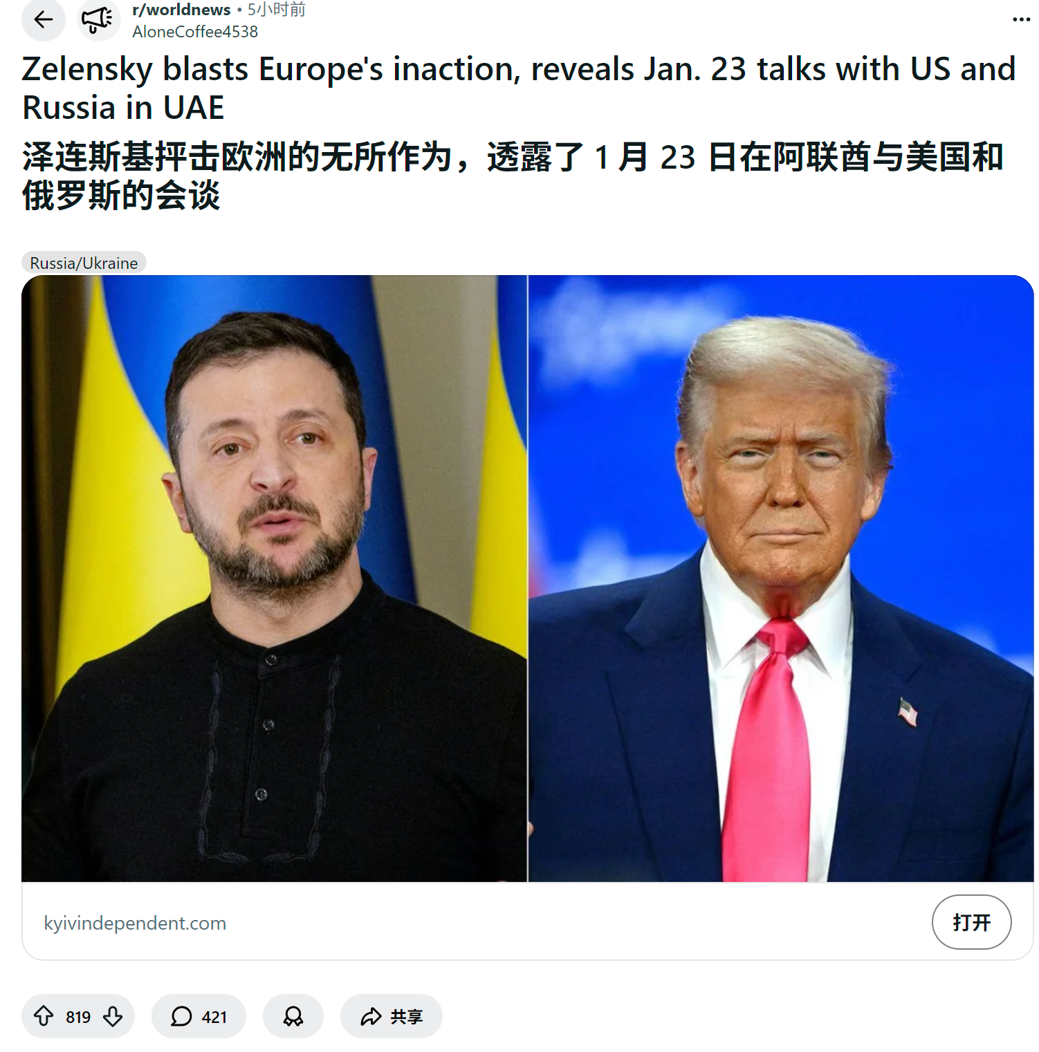 reddit热议 泽连斯基抨击欧洲的无所作为,透露了 1 月 23 日在阿联酋与美国和俄罗斯的会谈