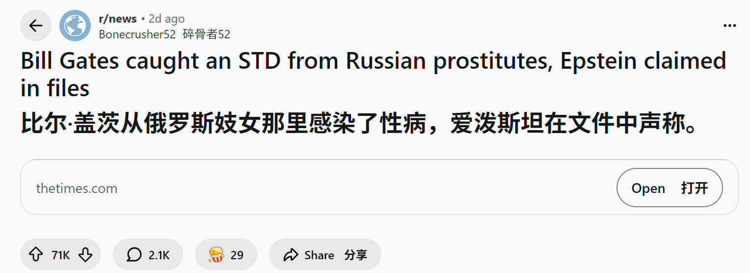 来源:https://www.reddit.com/r/news/comments/1qro0w7/bill_gates_caught_an_std_from_russian_prostitutes/
