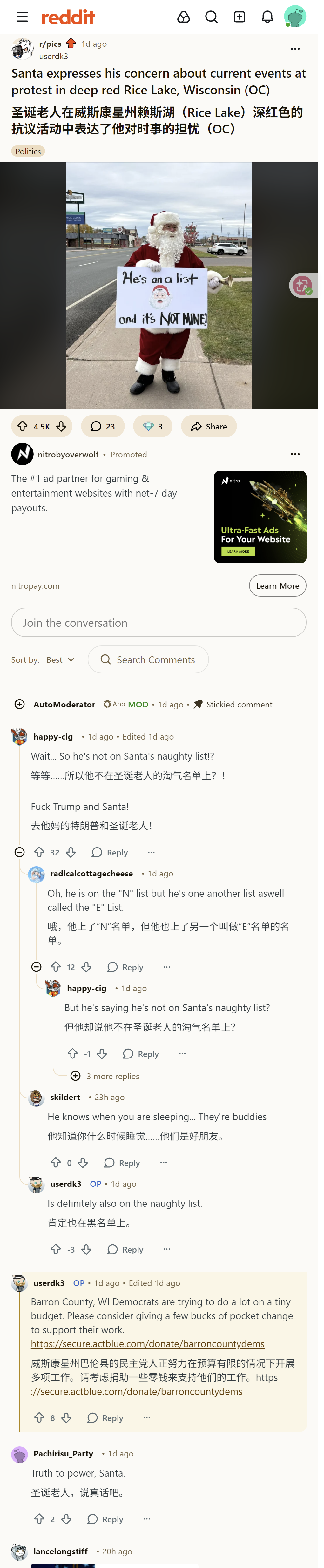 有用户发布了圣诞老人在威斯康星州赖斯湖抗议活动中表达对时事担忧的内容,发帖人号召为当地巴伦县民主党捐款。评论区有人怒骂特朗普,调侃其上了特殊名单,也有人称赞圣诞老人敢说真话。
